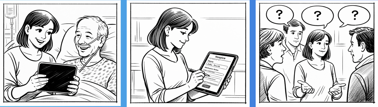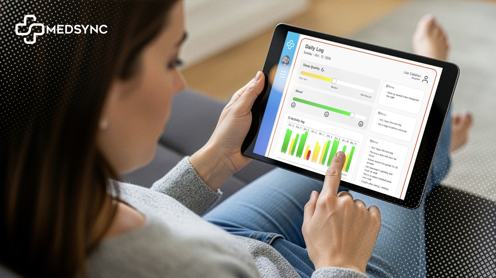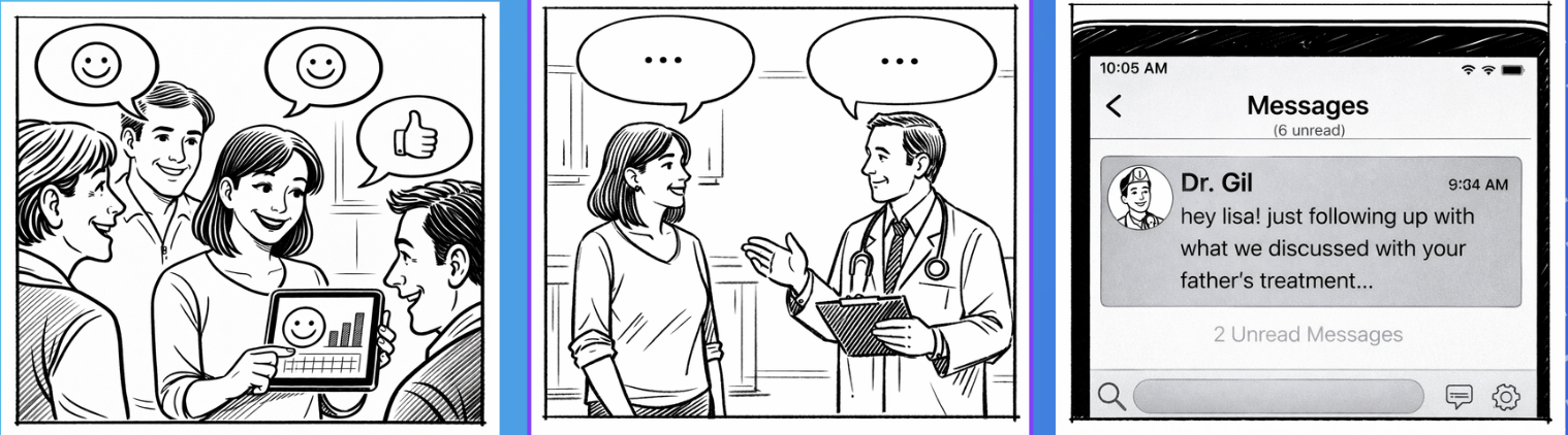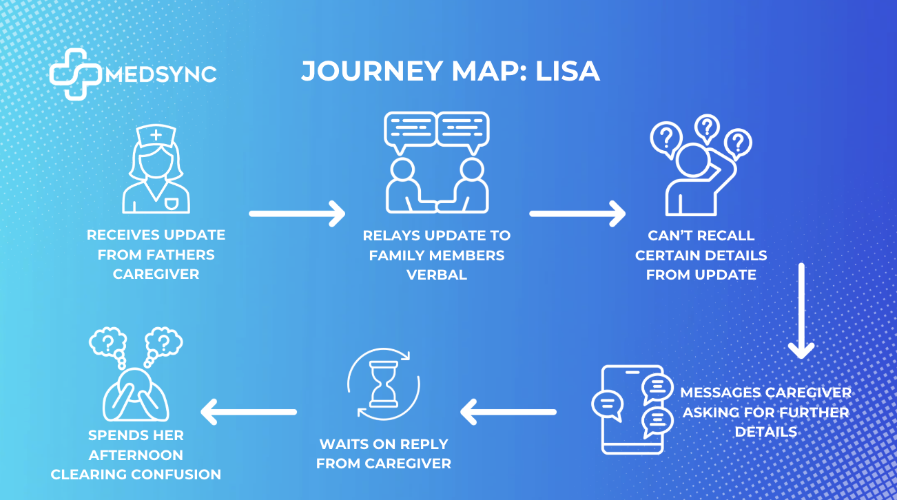 Lisa shows them her father’s Medsync dashboard, displaying his current condition in a readily visible, easy to digest format.