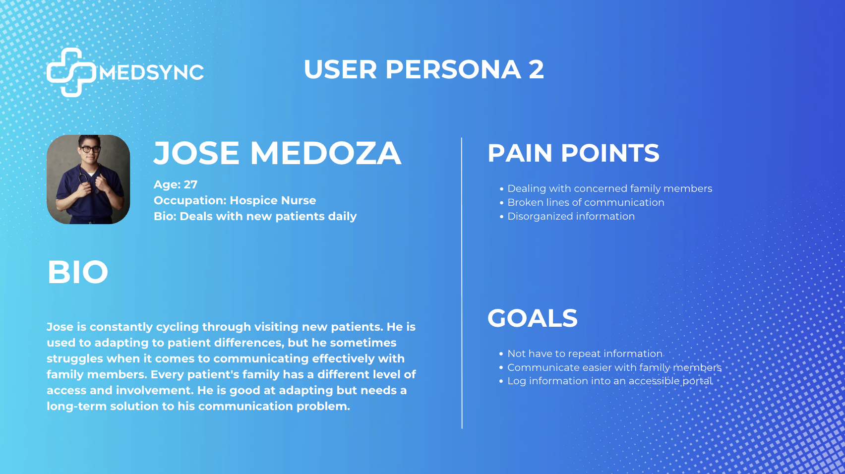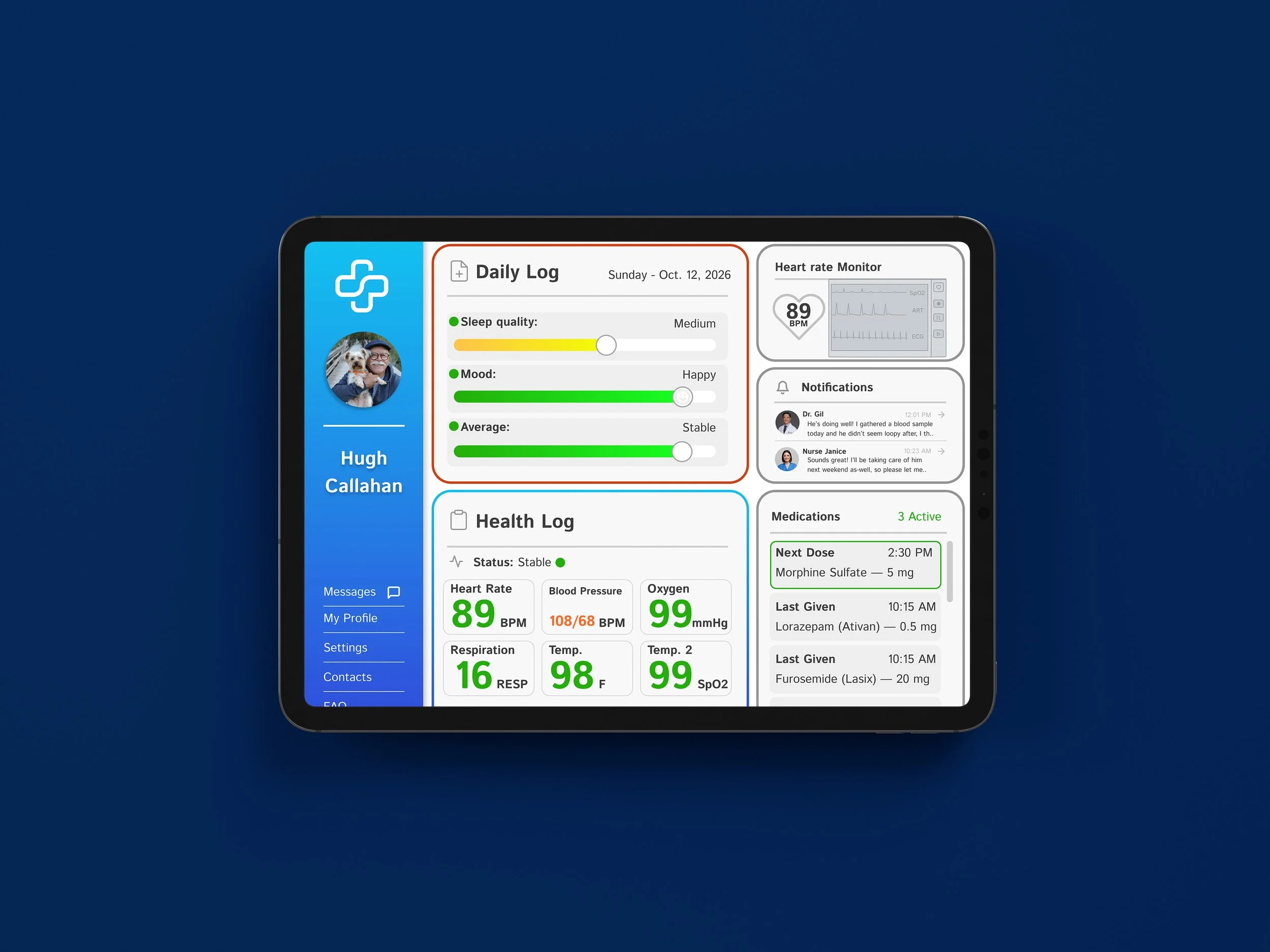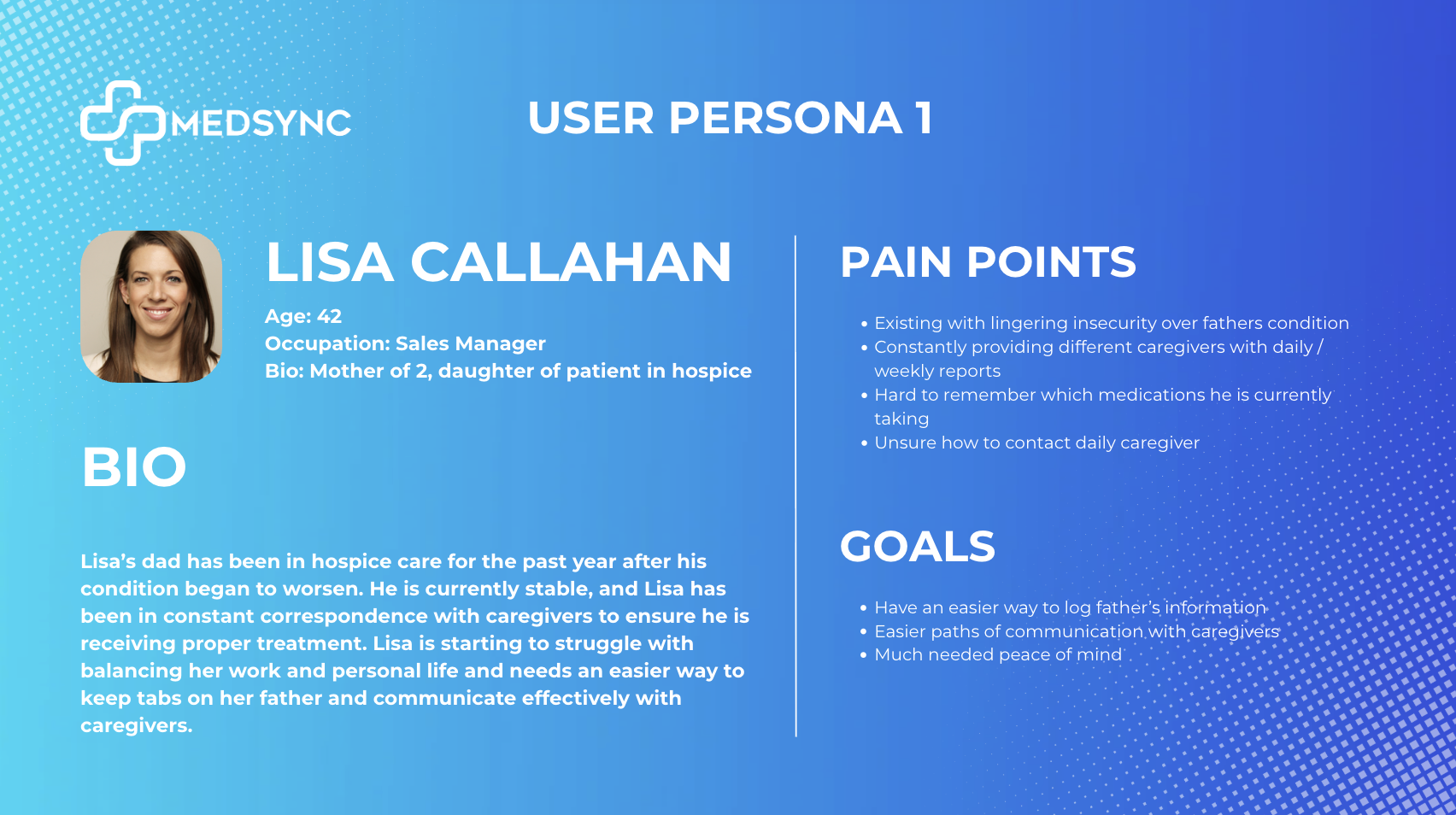 Lisa shows them her father’s Medsync dashboard, displaying his current condition in a readily visible, easy to digest format.