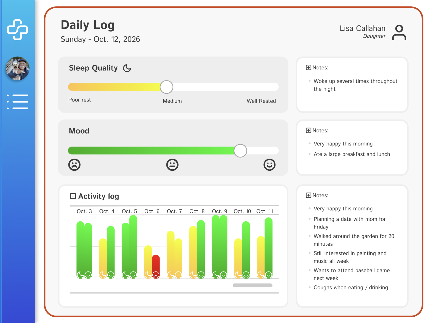 After, Lisa logs her father’s mood and sleep, and makes note of his activities.